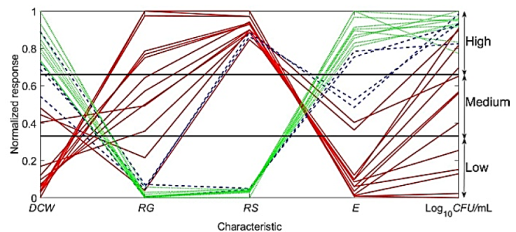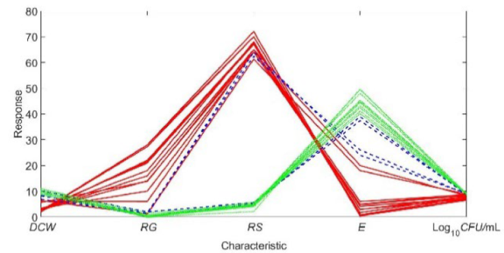 The characteristics that are in a limited range are DCW and CFU/mL, and their influence on the other characteristics is observed in the production of ethanol ("Figure 1"). Characteristic E (ethanol) can be considered as a reference to analyze the coupling of the other characteristics, for which there are three intervals ("Figure 2"): a) E > 40 g/L, b) g/L and c) g/L. For the first interval a) g/L, high values of DCW, low values of RG, low values of RS and high values of CFU/mL are observed. For the second interval b) g/L, high and medium DCW values, low RG values, high RS values and high CFU/mL values are observed. Finally, for the third interval g/L, low and medium values of DCW, high, medium, and low values of RG, high values of RS and high, medium, and low values of CFU/mL are observed for the kinetics of the fermentation. The situation is due to the consumption of substrate by the yeast obeying the reaction rate. The first substrate consumed is glucose, then the diauxic phenomenon biases the reaction toward sucrose consumption. At the end of the fermentation, the ethanol produced as desired product is a consequence correlated with the substrate consumed and the temperature.