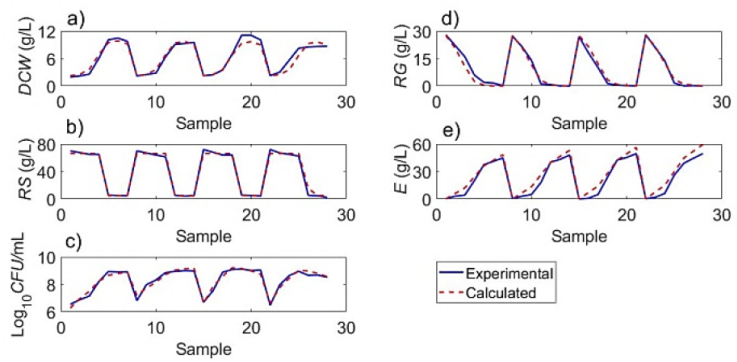 The experimental dynamics of the fermentation process are presented using the experimental characteristics DCW, RG, RS, E, and CFU/mL (see "Tables 2-6" and "Figures 1-2").