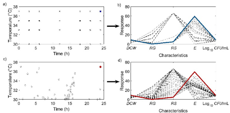 For the second interval (b) , high and medium values of DCW, low values of RG, high values of RS, and high values of CFU are required. In contrast, for the third interval , low and medium values of DCW, high, medium, and low values of RG, high values of RS, and high, medium, and low values of CFU are observed to be required. This trend is also reasonable because lower CFU results in lower production of E. One solution to this situation is to allow the fermentation to continue for a longer time. However, this approach is unfavorable from an industrial perspective. This situation arises since the yeast acts as a biocatalyst, consuming the substrate according to the reaction rate. Glucose is the first substrate to be consumed due to the diauxic phenomenon, and then sucrose is metabolized once the initial glucose present in the molasses is depleted. At the end of fermentation, the desired product, E, is produced consequently correlated with the consumed substrate, the concentration of cells (DCW), and the operating temperature. "Table 3" shows the dynamics of RG as a function of time and temperature. The decrease in RG is inversely proportional to time, with the most drastic results at . There are similarities in the RG values, specifically at: (a) g/L, (b) RG = 28 g/L, (c) RG = 0.2 g/L and (d) RG = 0 g/L.