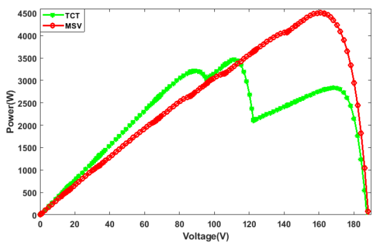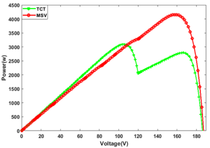 In Figure 9, we plot the calculated P-V characteristics for the TCT and MSV configurations in the case of an LW shading pattern. It can be observed that the electrical P-V features are more linear in MSV, and the global peak is more clearly defined compared with the TCT, which has two local peaks. Also, it is clearly shown in Figure 9 that the output power of the MSV configuration is higher than that of the TCT. Therefore, the PV modules arrangement based on the MSV model will increase the output power produced by the PV array.