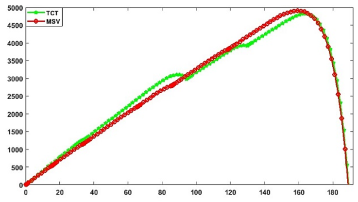 In Figure 10, we reported the calculated P-V characteristics for the TCT and MSV configurations in this case of the SW shading pattern. It is clearly shown that the P-V characteristics of the MSV are more linear than the TCT topology, and then the global peak is more clearly defined compared to the TCT, which has multiple local peaks. Therefore, the arrangement of the PV modules according to the MSV configuration improves the power produced by the array. It can, therefore, be concluded that in this case of SW shading, the generated power of the MSV configuration proposed is greater than that of the TCT.