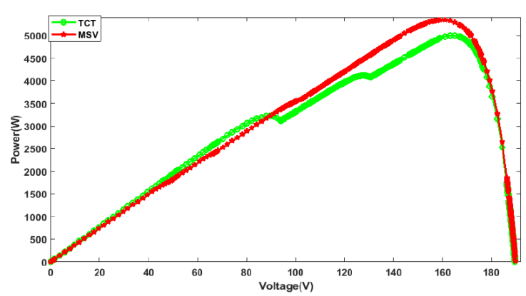 Table 4 presents the global maximum power point (GMPP) of TCT and MSV configurations under a LN pattern. In the case of this partial shading, the MSV configuration reached a maximum power of 5152.13 W against 4811.52W for the TCT. So, based on MSV configuration, we can increase the output power by 7.07%, which is rather significant.