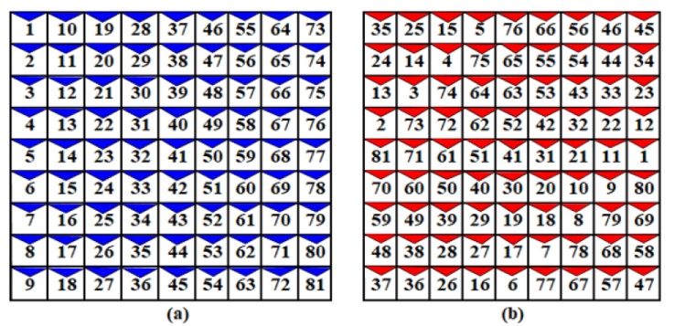 In our previous work (Iysaouy, Lahbabi, et al., 2019), a new method of shade distribution called the magic square view is proposed. In this method, we consider a (j ×j) PV module matrix, where j represents the number of rows and columns and must be odd j = (2i + 1) with i is an integer between 1 and n2 in a linked array (j × j) TCT. This method consists of a rearrangement of the PV panels of the array in such a way that the total of the entries of any row, column, or diagonal remains equal. An example of this arrangement of PV panels in MSV configuration for a (9 × 9) network is illustrated in Figure 4 (b). In this example, we place the integer 1 in the middle of the 9th column, then place the number of the next panel 2 in the lower right part of the present module. If this position is already occupied by another panel, the next panel must be placed immediately to the left of this module. It can be noted that this approach is based on a " wraparound " array. Thus, if a PV panel is displaced off on one side of the PV panel, it re-enters the opposite (Iysaouy, Lahbabi, et al., 2019). By increasing the incoming current to a specific node, thereby minimizing the bypass of the panels.