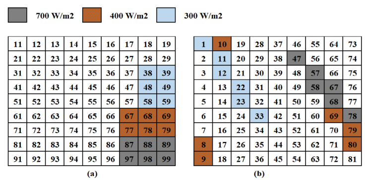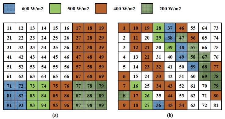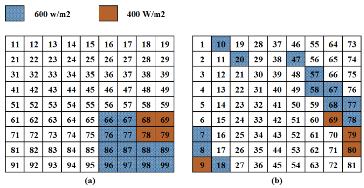 This is so-called as only some columns are partially shaded and could appear as a group anywhere in the array. This case of shading in the TCT configuration is shown in Figure 7 (a). Further, Figure 7 (b) presents the conventional arrangement in which the magic square method is applied. According to this shading pattern, a photovoltaic array is divided into four distinct clusters by irradiation levels. In this case, the array is exposed to four irradiation levels which are 900 W/m2, 700 W/m2, 400 W/m2, and 300 W/m2, respectively.