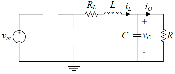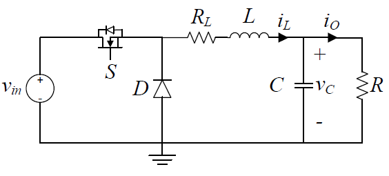 The buck converter has seven elements: a power supply (vin ), a switch (S), a diode (D), an inductor (L), a series resistance of inductor (RL ), a capacitor (C), and a load (R)