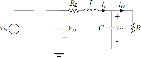 Applying Kirchhoff's laws to the circuit in Figure 2, we obtain the equations for iL (Eq. 1) and the voltage across the capacitor (vC ) (Eq. 2).