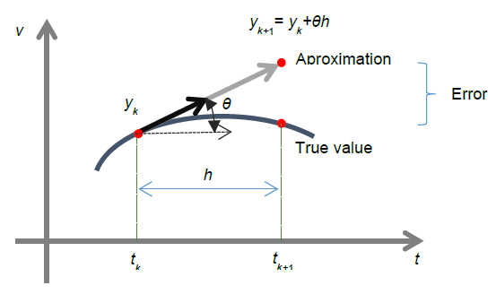 To solve differential equations using numerical methods, a known value (yk ) and the slope of the function (θ) are used, with these data it is possible to calculate an approximation to the following value (y(k+1) ), of the function in an integration time (h), this can be seen graphically in Figure 5.