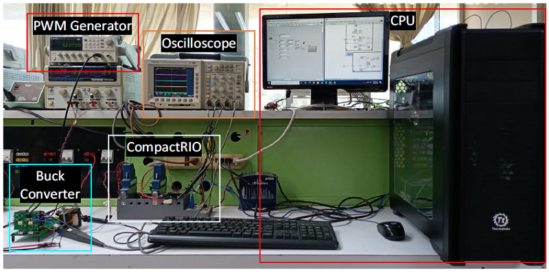 The main ones are: a function generator to generate the PWM signal, the buck converter, the CompactRIO in which the converter model is programmed and the analog outputs (in this case the simulated inductor current and capacitor voltage), are obtained, an oscilloscope to be able to visualize the signals of the real converter and the simulation at the same time, and finally, the CPU in which the model of the converter was programmed, the graphic user interface (GUI), is running.