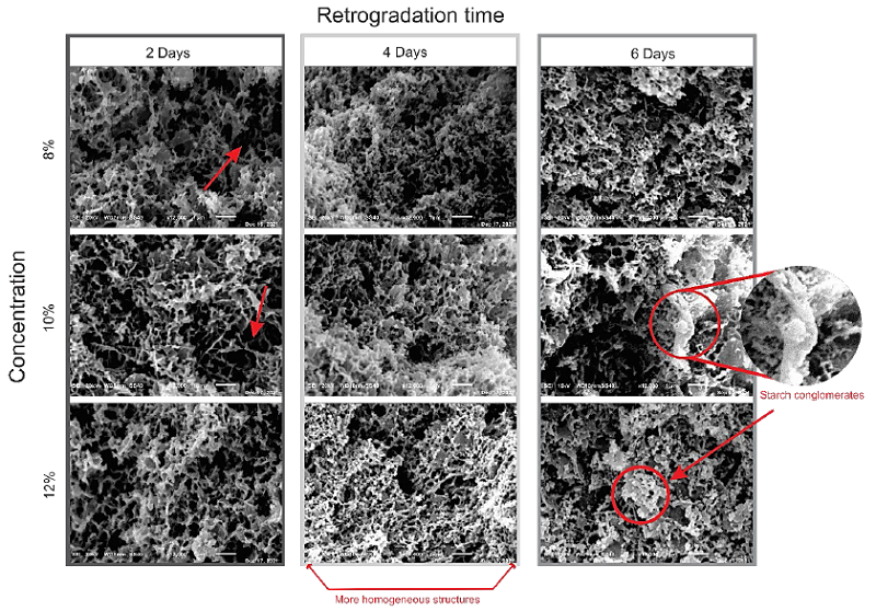The comparison of the images obtained from the aerogels with different concentrations and retrogradation times and the aerogel morphology are shown in Figure 2. With 2 days of retrogradation, open areas with large spaces are observed. With the increase in days, it is possible to observe a greater amount of mass and the presence of some conglomerates. At 6 days of retrogradation, the gels show a larger pore size and some lump structures, while those that underwent 4 days of retrogradation showed homogeneous structures and more defined pore sizes. This behavior can be associated with the fact that during retrogradation, the starch molecules cross-link to return to their original structure, associating with each other and generating this morphology.