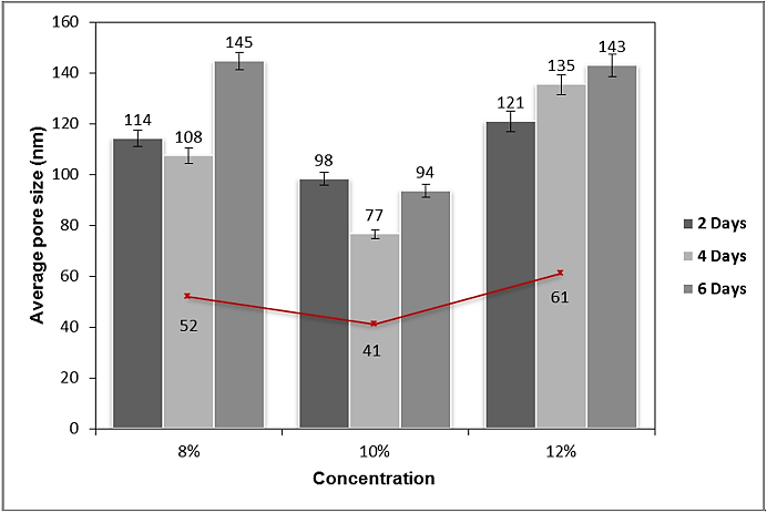 The pores were measured to obtain the means shown in Figure 3. The figure presents the tendency of these materials according to the starch concentration and retrogradation days as well as the minimum pore size measured at every concentration (%). The average pore size in aerogels at day 4 of retrogradation is smaller but it increases in aerogels at 6 days. A similar behavior is present when increasing the concentration (%) of rice starch. The samples with 4 days of retrogradation and a concentration of 10% (4D-RSA-10%) showed the smallest pore size (41 nm diameter) and an average of 77 nm. Ubeyitogullari and Ciftci (2016) obtain wheat starch aerogels by supercritical drying with an average pore size of 20 nm. They observed this property is related to the surface area (53.5, 59.7, and 52.6 m2/g in samples prepared with 5, 10, and 15% wheat starch, respectively). They found no relationship between the concentration and the specific surface area of the aerogels. El-Naggar et al. (2020) describes that vacuum drying contributes to the collapse of the aerogel molecular structure, producing pores of large size. However, the use of vacuum drying in this work did not lead to the collapse of the structures, but instead generated materials with nanometer-sized pores. This demonstrates that it is possible to produce rice starch aerogels under this process.
