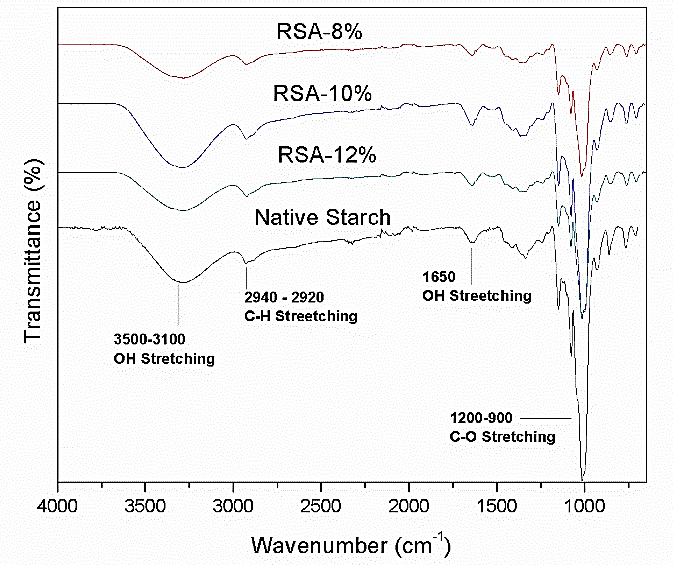 The materials obtained are named according to their days of retrogradation, followed by the acronym for rice starch aerogels (RSA) and by the starch concentration used. Then the sample with 4 days of retrogradation and an 8% concentration is called 4D-RSA-8%, for the 10% sample it will be 4D-RSA-10%, and the 12% sample is then 4D-RSA-12%.