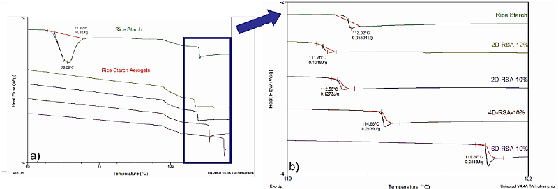 On the other hand, there is a clear increase in enthalpy and the temperature required for Tg in 10% concentration samples (2D-RSA-10%) vs 12% samples (2D-RSA-12%). This means 10% aerogels tend to show better reorganization properties, both crystalline and amorphous).