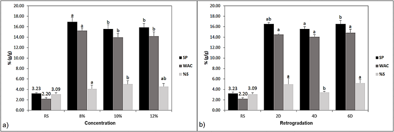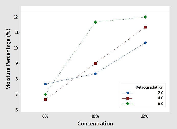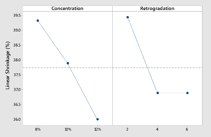 The statistical analysis of the data was carried out using Minitab 18 software with a 2-factor design (concentration and retrogradation). A one-way analysis of variance (ANOVA) was carried out with 0.05 significance, using a sample size n=3, and a general linear model to compare means.