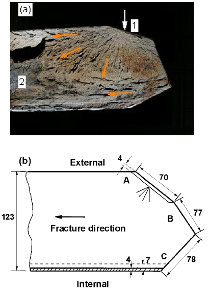 Figure 2 (a) shows the as-received fractured steel plate. It is obvious that the fracture initiated and propagated in the longitudinal direction of the rolled plate, as indicated by “B” and red arrows. The result from examination displayed no gross deformation, necking and thinning of the plate adjacent to the fracture, meaning that the steel plate underwent brittle fracture during the rolling process. It is evident that the edge of the failed steel plate was beveled by the gas cutting process, which was prepared for the circumferential weld joint. It is also obvious that there was a thickness transition in the edge of the plate, which prepared for the head part of the drum.