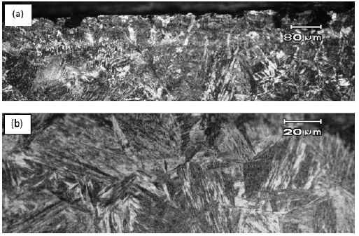 The microstructure of the edge “A” investigated from the external surface to the mid-wall plate was shown in Figure 5 (a)-(b) and the microstructure transformation was obviously observed, indicating that these areas was heat-affected from the gas cutting process. Technically, the gas cutting process provides the preheat flame, which can raise the edge of the steel plate to about 980oC so that the steel at the edge can be oxidized and then blown away (Adedayo, 2011).