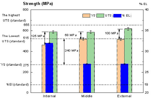 To obtain useful information about the fabrication of this steel plate, a tensile test and Charpy impact test were conducted. Tensile test was conducted according to ASTM A370-21 (ASTM A370-21, 2021). and round specimens for tensile test were prepared from the inner, the mid-wall, and external part of unaffected areas of the failed steel plate. Their diameter was 12.5 +/- 0.2 mm and gauge length were 50+/- 0.1 mm. The averaged properties obtained from tensile test and the standard values of properties were given in Figure 6. Results of testing revealed that the steel plate has complied with the standard requirement of mechanical properties. However, the yield strength value of all tensile test specimens was significantly higher than that specified in the standard requirement.