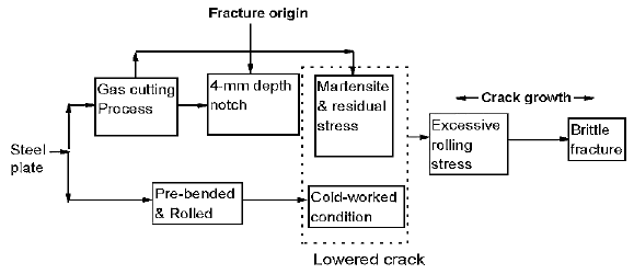 The rolling process can produce cold-worked conditions to the steel plate. All potentially reduced the crack resistance of the steel plate. During fabrication, steel plate experienced rolling stress, which was excessive. The notch would function as the stress concentration and then became the crack origin. The excessive forming stress accelerated the crack propagation through the degraded crack resistance steel plate, finally causing the brittle fracture as clearly observed from Figure 2 and 3. Based on the results of this investigation, the recommendations, it is advised to remove the notch by grinding. Grinding the notch removed not only the stress concentration effect but also the heat affected area. The results from the Charpy impact test provided the fact that warming up the steel plate to be markedly above 0oC is useful to improve the toughness of the steel plate.