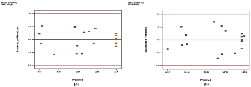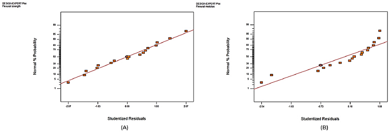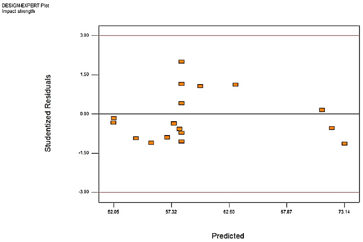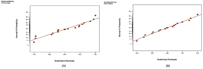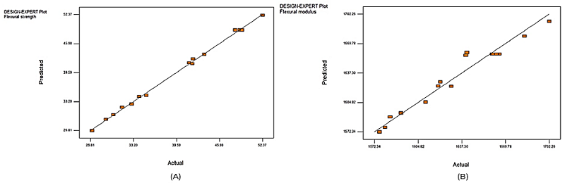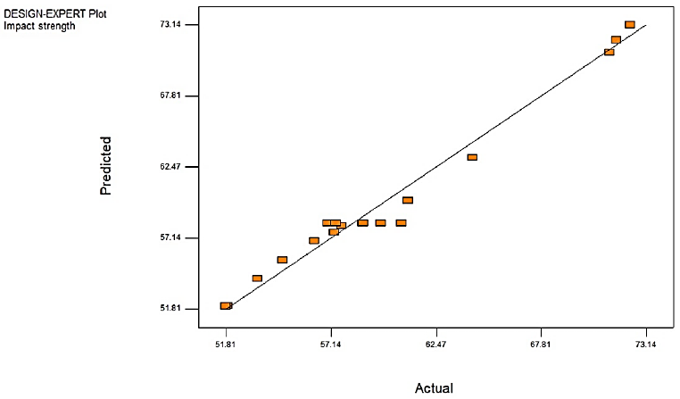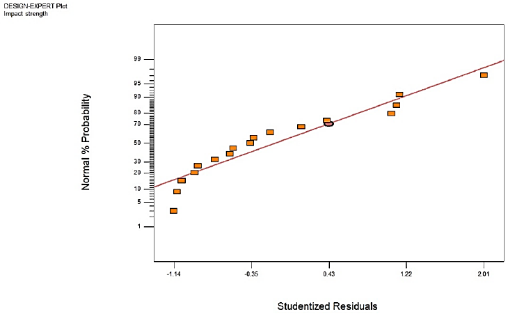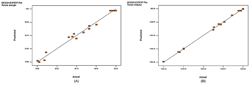 validation of regression models at 95% confidence interval was explained in terms of p, F, and R2 values. The insignificant “Lack-of-Fit” and p-values less than 0.05 confirmed the rejection of null-hypothesis. The model F (107.22) and p (<0.0001) values for tensile strength, F (560.03) and p (<0.0001) values for tensile modulus, F (475.55) and p (<0.0001) values for flexural strength, F (36.64) and p (<0.0001) values for flexural modulus, and F (53.86) and p (<0.0001) values for impact strength showed that the quadratic model was significant. The regression model was further analyzed by evaluating R2, adjusted R2, and predicted R2 which indicates the proportion of total variation in response variable predicted by model. The higher correlation coefficients confirm the suitability and correctness of the model. The adjusted R2 can be used to prevent probability error while predicted R2 indicates how well the model predicts responses for new observations. The adjusted R2 and predicted R2 are in reasonable agreement with the values of 0.9755 and 0.9433 for tensile strength, 0.9968 and 0.9816 for tensile modulus, 0.9963 and 0.9820 for flexural strength, 0.9304 and 0.8446 for flexural modulus, and 0.9586 and 0.9256 for impact strength, respectively. The R2 value for response variables implying that a high correlation exists between observed and predicted values. In addition, the adequacy of the model was confirmed using normal probabili-ty plots of the residuals, predicted versus actual values, and residuals versus predicted values plots. Figures 2-4 revealed that the error points are normally distributed along a straight line, implying that the model is adequate, and it represents the experimental data. The correlation between predicted response values and the actual values is shown in Figures 5-7, presenting uniformly distributed data points around the mean of the response variables. The linear regression fit is obtained with an R2 values of 0.9847, 0.9986, 0.9984, 0.9565, and 0.9767 for the tensile strength, tensile modulus, flexural strength, flexural modulus, and impact strength respectively, indicating that the model is accurately describing the experimental observations. In the end, the final plots of residuals versus predicted values (Figures 8-10) concluded that the residuals scattering for all mechanical responses were not significant which confirms that the proposed model was suitable. The maximum error (Tables 15-17) lies in between predicted and measured values were 4.10%, 0.26%, 1.51%, 1.01%, and 4.02% for the tensile strength, tensile modulus, flexural strength, flexural modulus, and impact strength, respectively.