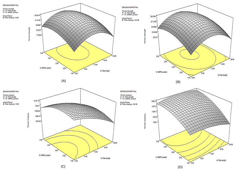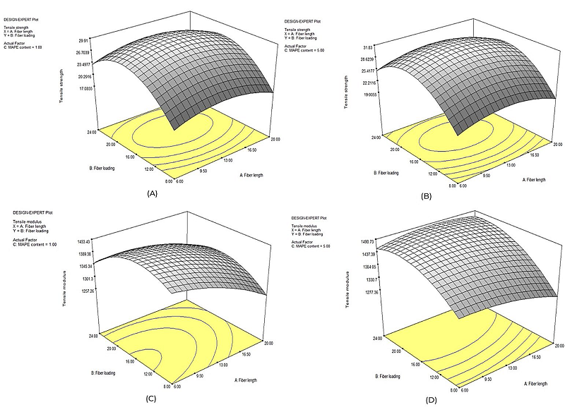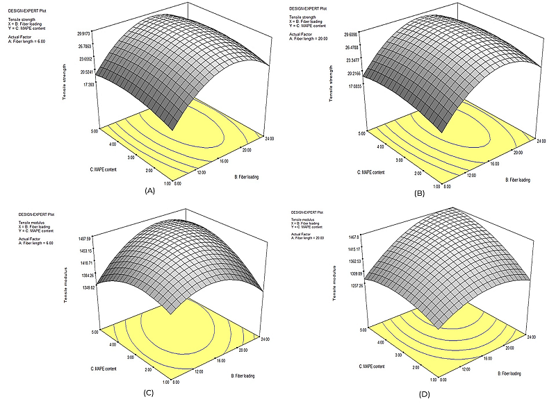 Figure 11 (a)-(d) illustrate the 3D surface response plots for tensile strength and modulus as a function of fiber length and content, keeping the MAPE load fixed at 1 and 5 wt.%. The tensile strength was increased to a maximum value and then decreased slowly with the increase of fiber length. However, the tensile modulus was varied inversely with fiber length, and it was due to the severe fiber breakage and fibrillation of longer PALF during composite compounding. Irrespective of fiber length, the incorporation of PALF beyond a specified limit did not produce any significant reinforcing effect. This was because of the agglomeration and poor interfacial adhesion of fibers within the polymer matrix.