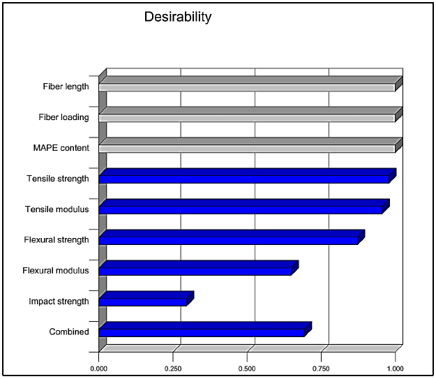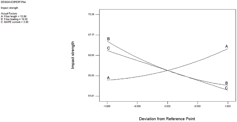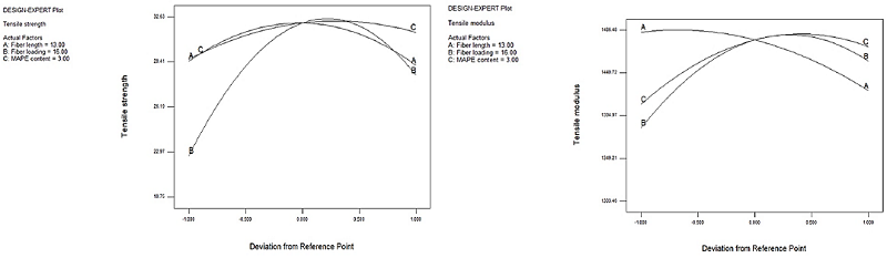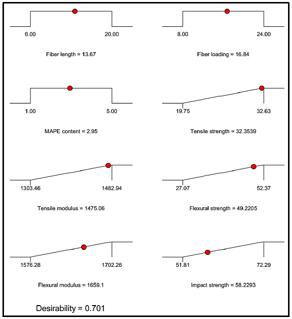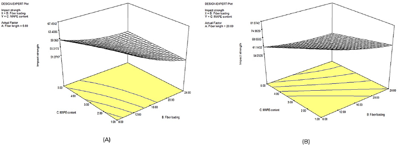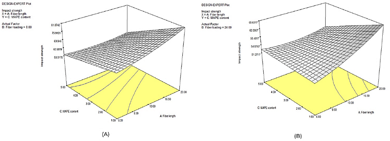 The experimental and statistical results showed the significance of all three influential variables, i.e., fiber length, fiber loading, and MAPE content on tensile, flexural, and impact properties. Furthermore, the interaction of fiber loading and MAPE were highly related to the mechanical properties of biocomposites.