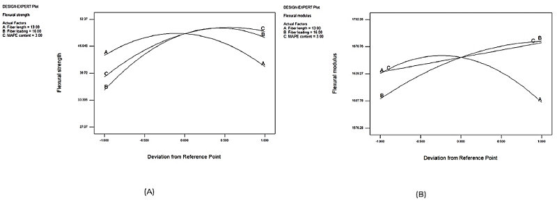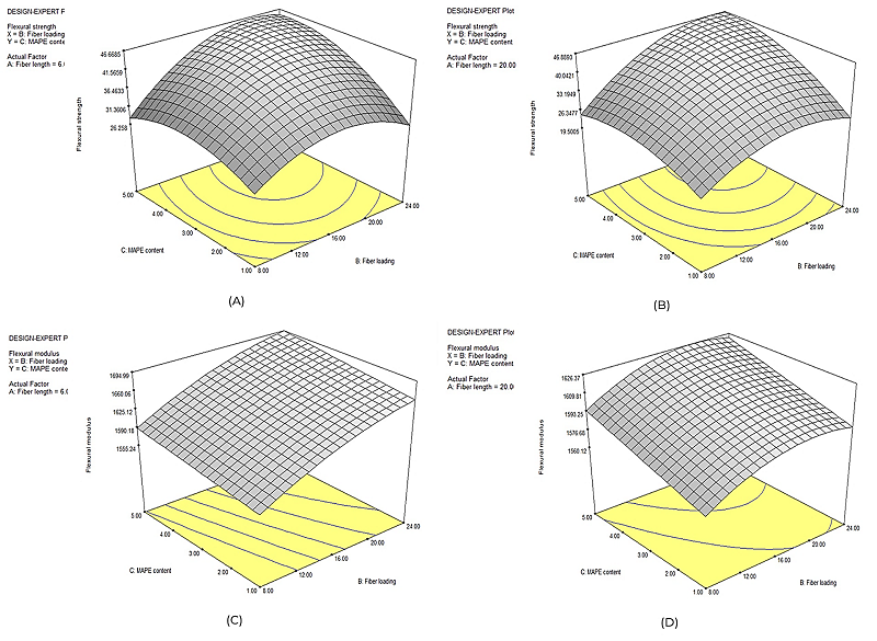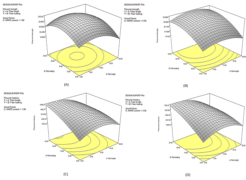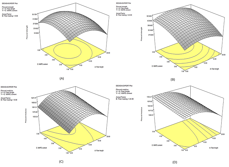 Figure 16 (a)-(d) reveals the combined effect of fiber length and MAPE content on flexural properties of biocomposites. It was observed that for all fiber length, the flexural strength and modulus were increased with the increase of compatibilizer load, and it was due to the formation of covalent linkages in between anhydride and hydroxyl (-OH) groups of fibers. The interaction effect of fiber loading and MAPE content on flexural properties of biocomposites is shown in Figure 17 (a)-(d). It is worth to noted that the reinforcement efficiency of PALF was significantly increased after the addition of compatibilizer. The interaction between fiber loading and MAPE content significantly affects the flexural strength (p-value BC<0.05). The 4.5 wt.% MAPE compatibilized composite having 22% fiber content with 14 mm length exhibits maximum flexural strength (Table 18).