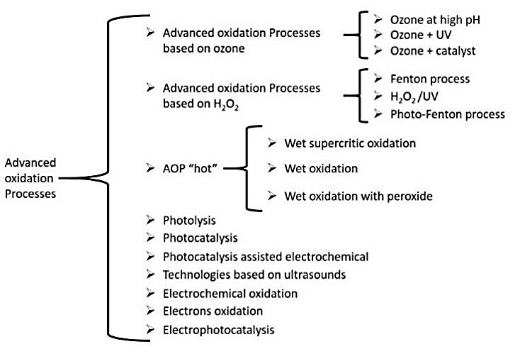 Strong oxidizing agents like ozone are well-known and often used for the treatment of both water and wastewater. Even at high pH levels, ozone is quite effective. Ozone interacts indiscriminately with all chemical and inorganic molecules present in the reaction media at these high pH levels (>11.0). Direct molecular reactions and indirect chain reactions of the radical type are the two main ways that ozone interacts with wastewater chemicals. However, the high cost of generating ozone might have created problem for is effective usage. Hammadi et al. (2016) presented a schematic diagram of a water treatment process using ozone (Figure 5). Other classification of AOPs based on source of radicals is presented in Figure 6.