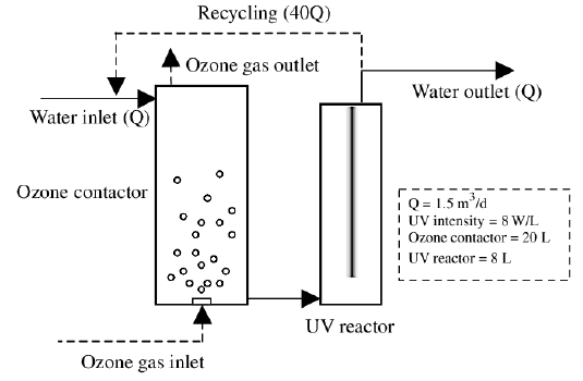 In many instances, conventional ozonation of organic molecules does not fully oxidize organics to CO2 and H2O. After oxidation, the remaining intermediate intermediates in some solutions may be just as harmful as or even more poisonous than the original molecule, and UV light may help to finish the oxidation reaction. For effective ozone photolysis, UV lamps must have a maximum light output of 254 nm. H2O2 may be produced by the photolysis of ozone in water using UV light with a wavelength of 200-280 nm. UV photons are used in the O3/UV process (Figure 8) to activate ozone molecules and facilitate the production of •OH. O3/UV was reported by Shu and Huang (1995) to be superior to UV or ozonation alone as a technique for decolorizing dyes. All types of UV light sources, aside from low pressure mercury vapour lamps, can be employed in this procedure. The effectiveness of the system is influenced by several factors, including pH, temperature, scavengers in the influent, turbidity, UV intensity, lamp spectrum features, and types of pollutant.