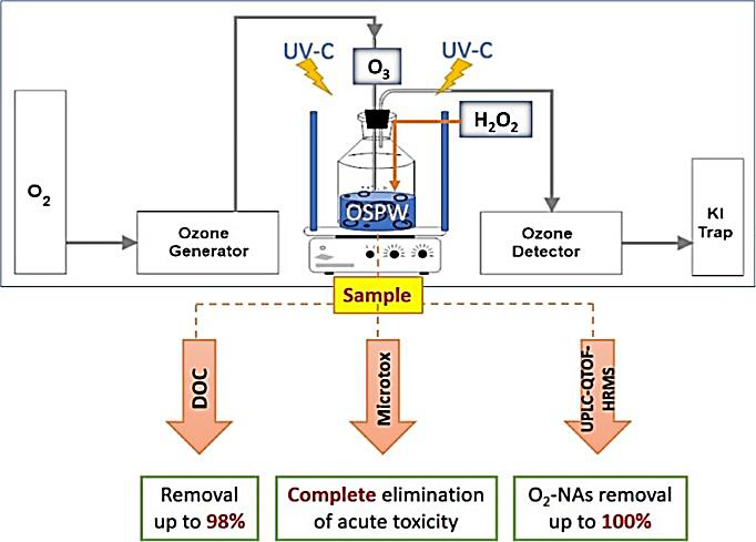 The O3/ H2O2/UV technique is the most potent and successful one for quickly and completely mineralizing contaminants. The generation of •OH is impacted by rising pH, just as other types of ozone and AOPs. Additional UV radiation use has an impact on the development of •OH. Through secondary reactions, the addition of H2O2 to the ozonation system increases the process's ability to oxidize. The breakdown of O3 is initiated by H2O2 by an electron transfer. The optimal O3/H2O2 molar ratio is 2:1, and the procedure is quick and effective in treating organic pollutants at extremely low concentrations (ppb), at pH levels between 7 and 8. The increase in ozone transfer in water caused by H2O2 has been hypothesized to be the cause of the acceleration of ozonation. This combined AOP can be used to treat water with a strong UV background since ozone has a greater absorption coefficient than H2O2. The treatment of oil sands process water with O3/H2O2 and UV-C light irradiation is shown in Figure 9.