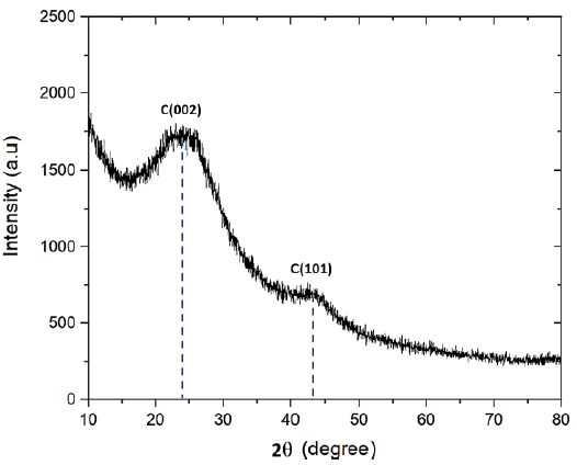 The XRD pattern, as shown in Figure 1, showing carbon structure, which tends to be amorphous, is indicated by broad and weak diffraction peaks.