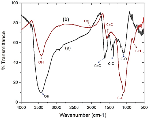 The area peaks between 1400-1650 cm−1 and 3200-3700 cm−1 show the C=C stretching bond of the aromatic ring and the O-H (hydroxyl) groups, respectively, which are significantly weaker after activation. The decrease in C=C stretching vibration intensity is due to the oxygenation of the graphitic carbon matrix. The self-cracking of chars damaged the O-H groups and released H2 and CO (Lu et al., 2017).