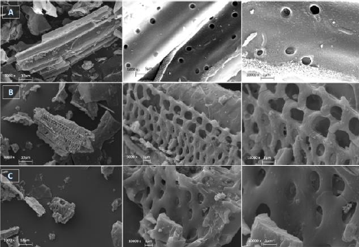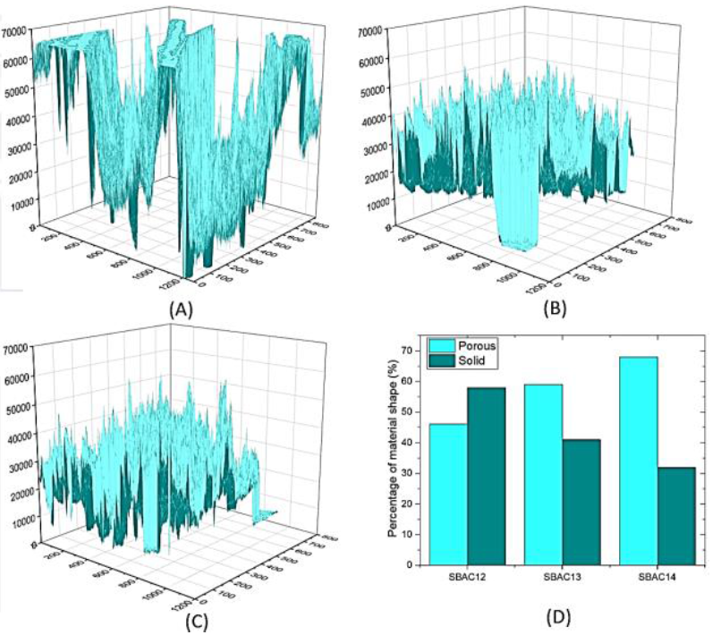 Quantitatively, Figure 4 compares the pores distribution of SBAC surfaces. The SBAC14 had the highest surface porosity at 68%, followed by SBAC13 at 59% and SBAC12 at 46%. The surface porosity in SBAC12 appears to have a wide range of size variations and a less dense surface porosity, as shown in Figure 4A. Meanwhile, the surface porosity in SBAC13 and SBAC14 appears to have a smaller size variations range, tending to be the same, with a denser surface porosity, as shown in Figure 4B and 4C. The difference in surface porosity in the surface morphology occurred due to the addition of the KOH activator agent to carbon.