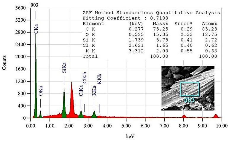 In the EDS results, there was also an element of Si, which was the main content of sugarcane bagasse left behind during the activation process. In contrast, K elements were residues from activation with KOH with less contents (< 5%). Meanwhile, the Cl element was a residue from washing activated carbon. The presence of the small amount of K and Cl elements indicated that the activated carbon washing process was successfully conducted.