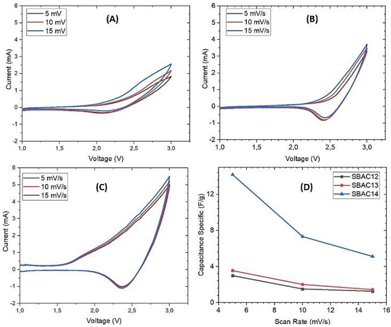 Based on Figure 6D, the smallest CV area was obtained by sample SBAC12, while the largest area was obtained by sample SBAC14. The specific capacitance value got smaller as the scan rate got higher. This was in accordance with the rules of Equation 2, where the specific capacitance value was inversely proportional to the scan rate. The largest specific capacitance value was 14.18 F/g produced by SBAC14 at a scan rate of 5 mV/s. Meanwhile, the specific capacitance for SBAC13/LTO and SBAC12/LTO was 3.55 F/g and 2.99 F/g, respectively.