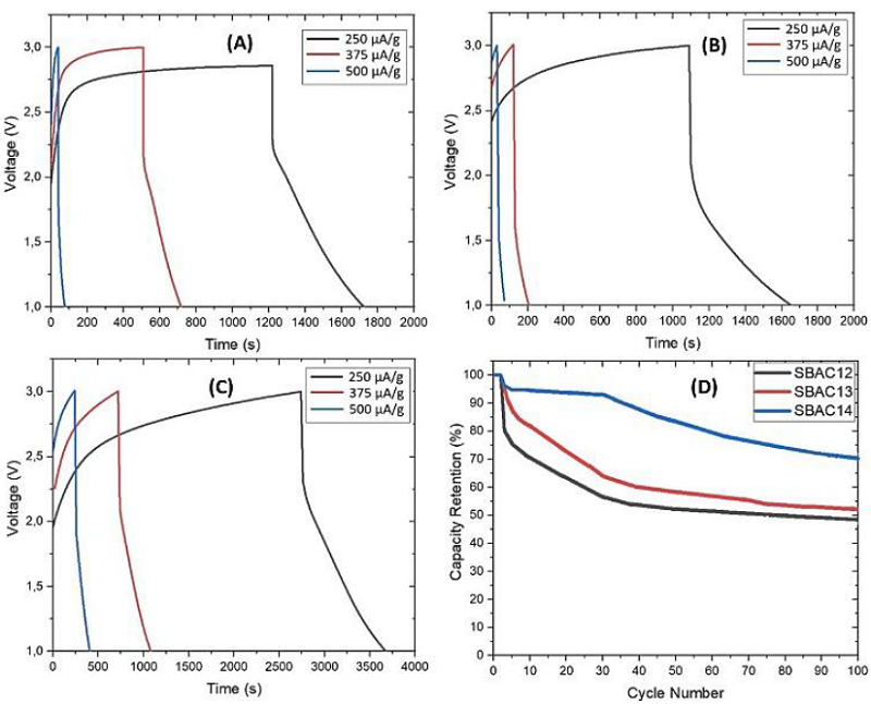 CD testing determines the performance and life cycle of energy storage cells. In this study, the CD test was carried out in a voltage range of 1-3 V with constant current variations of 250, 375, and 500 µA/g. The results of the CD test are shown in Figure 7.