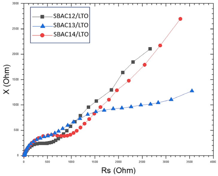 The greater the conductivity, the shorter the electron travel and lithium-ion diffusion distance; this will speed up the process of charging electrons from the anode to the cathode. Based on the formula in Equation 5, the conductivity value of SBAC12/LTO was 1.14 µS/cm, SBAC13/LTO was 2.21 µS/cm, and SBAC14/LTO was 6.59 µS/cm. The straight line in the Nyquist image showed the diffusion process of lithium ions into the electrode material, where the excellent intercalation process was at an angle of 450 (Sun et al., 2018). Based on Figure 8, SBAC14/LTO had a slope angle close to 450, indicating that the lithium-ion intercalation process in the electrode material has been running well.