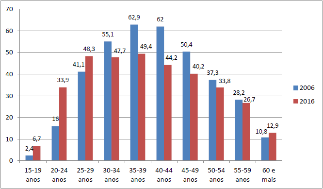 De 2007 até junho de 2017, foram notificados 194.217 casos de infecção pelo HIV no Brasil (BRASIL, 2017a, p. 5). Entre os homens, nos últimos dez anos, tem ocorrido crescimento da aids, especialmente entre jovens de 15 a 19 anos. De 2006 para 2016, a taxa de detecção de aids quase triplicou, e, na faixa etária de 20 a 24 anos, a taxa mais que duplicou. Apesar desses aumentos, a maior taxa de detecção de aids em 2016 ocorreu entre os indivíduos na faixa etária de 35 a 39 anos: 49,4 casos/100.000 habitantes, 21,5% menor do que a observada em 2006, conforme mostra o Gráfico 1 (BRASIL, 2017a, p. 12). Também houve crescimento na detecção de aids, na faixa etária de 60 anos ou mais.