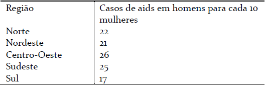 Desde 1980 até junho de 2017, 65% dos casos de aids ocorreram entre homens e 34,7% em mulheres (BRASIL, 2017-a, p.10). Entretanto, a razão de sexos tem diferenças regionais: proporcionalmente há mais mulheres afetadas pela aids na região Sul que homens, enquanto no Centro-Oeste há mais homens que mulheres afetadas. Na região Nordeste, de 2015 para 2016, caiu a razão de sexo, indicando um crescimento dos casos de aids entre mulheres (BRASIL, 2017-a, p. 11).