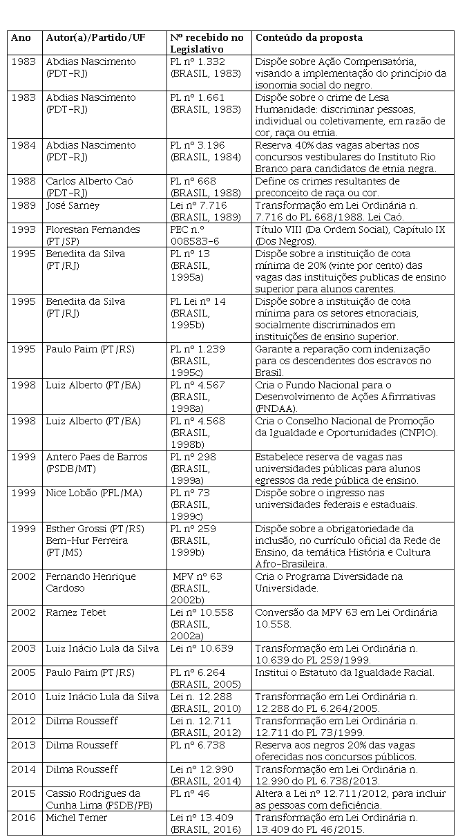 A seguir, o Quadro 1 sistematiza a trajetória das propostas legislativas e executivas acerca das ações afirmativas (abarcando algumas ações repressivas e valorizativas), assim como destaca a conversão em leis ordinárias pelo Poder Executivo dos projetos de lei.