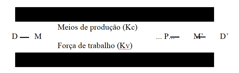 Para tratar desse assunto, retomemos, de partida, o processo de reprodução do capital. Conforme representação abaixo, o ciclo do capital tem seu início e fim na esfera da circulação, apresentando três momentos sucessivos que estão em permanente transformação (MARX, 1984b). Os momentos D-M e M' – D' referem-se à circulação de mercadorias e correspondem, respectivamente, às formas funcionais do capital monetário (ou capital dinheiro) e do capital mercadoria. O capital produtivo é o momento da produção, representado por ...P..., quando o valor se reproduzirá a partir da interação entre força de trabalho e meios de produção. Apesar das diferenças de cada fase, o sentido é o mesmo, qual seja, a manutenção do processo de valorização do valor. Daí seu caráter cíclico.