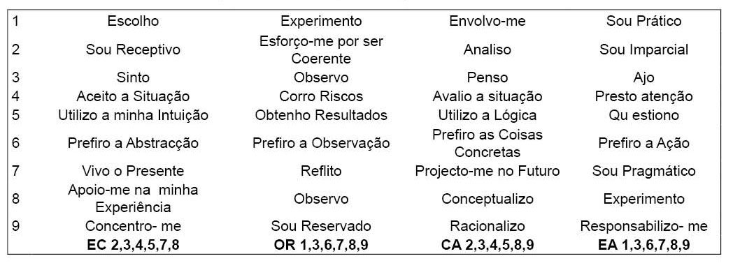 De maneira complementar, foiaplicado também o questionário de Kolb aos alunos presentes no dia 30 de junho de 2016,a fim de realizar uma caracterização dos alunos participantes em relação aos estilos de aprendizagem.O instrumentofoi criado por David Kolb (Learning Style Inventory – LSI) em 1976 e, no Brasil, foi revisado por Sobral em 1992(CERQUEIRA, 2008). Para os discentes foi aplicado o formato traduzido e adaptado pelo professor lusitano Luís Aguilar. Essa versão é composta por “nove séries de palavras, a serem ordenadas pelo estudante em graus de 1 a 4 de acordo, respectivamente, com a menor ou a maior probabilidade de aprendizado percebida por ele” (CERQUEIRA, 2008, p.119). Eis o modelo no quadro 4.