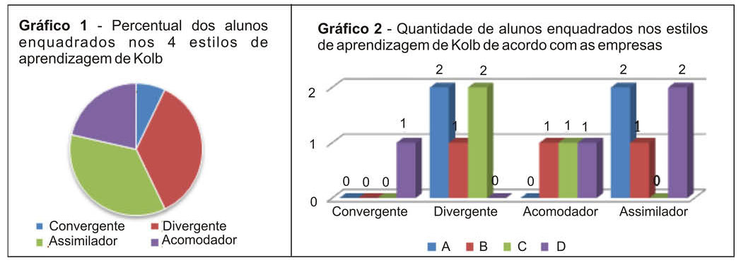No entanto, o estilo de aprendizagem divergente é evidente nas empresas A e C, cujo desempenho da disciplina está entre os melhores.Aempresa C permaneceu em primeiro lugar por várias semanas e a empresa A finalizou em alta, com o pódio. A empresa B não obteve bons resultados e consta também uma variedade nos estilos de aprendizagem.O estilo assimilador refere-se ao perfil de aprendizado voltado para a observação e para a reflexão. Os estudantes desse estilo são mais observadores e pensam mais antes de tomarem uma decisão. Tal situação é corroborada com as informações da observação participante, pois os alunos das empresas A e D demonstraram esse perfil. Já o estilo acomodador é considerado um aprendizado mais intuitivo, isto é, as pessoas são guiadas mais pela intuição,nãopela lógica. Todas as empresas possuem algum membro com esse perfil de aprendizagem, exceto a empresa A, ganhadora da simulação industrial.