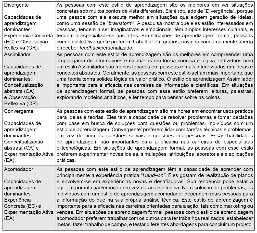 Dessa forma, Kolb (1984) desenvolveu o denominado LSI, cuja interação cíclica entre essas quatro habilidades resulta em quatro dimensões de aprendizagem, ou estilos de aprendizagem: convergente, divergente, assimilador e acomodador, observado no quadro 3: