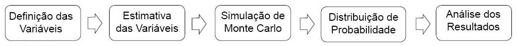 O processo de simulação pelo método de Monte Carlo efetua-se pela definição das variáveis nas quais ocorrerão os choques de aleatoriedade, alocando uma distribuição de probabilidade dada pelo histórico passado da variável. Depois do processo de identificação de cada variável, inicia-se o processo de geração de números aleatórios, conforme a faixa adotada para cada variável de entrada. Depois de gerados os valores para as variáveis de entrada (inputs), calcula-se automaticamente os valores das variáveis de saída (outputs) a partir das interações já firmadas entre elas, em que cada geração da série de números significa um cenário provável de ocorrência (ROGERS; SANTOS; LEMES, 2008).