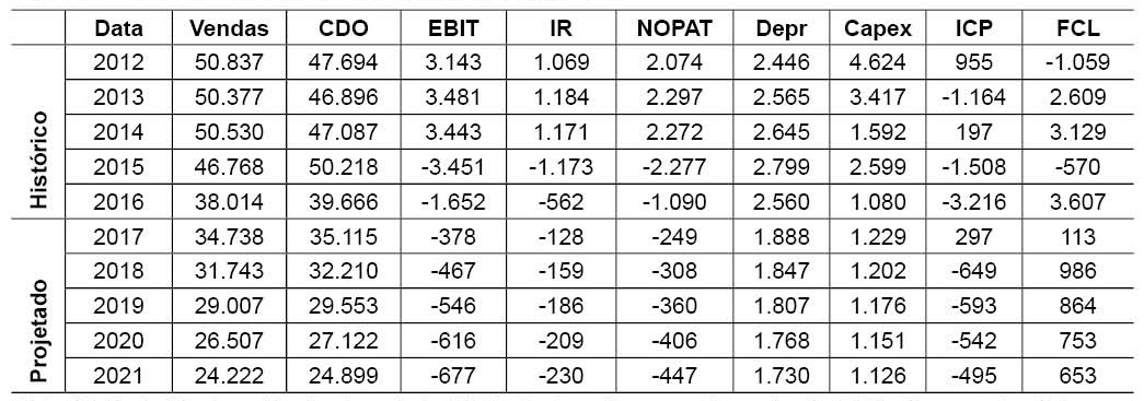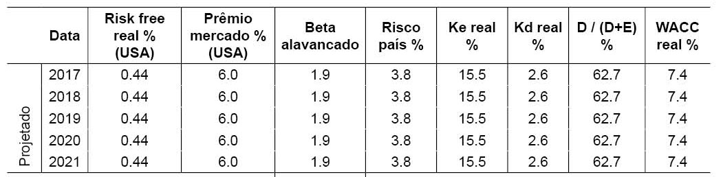 Dados da pesquisa – 2017Os valores referentes ao crescimento das vendas e EBITDA foram, respectivamente, de -8,6 e 4,3%. A projeção do CAPEX e depreciação foi, respectivamente, de 6,2 e 65,1%, sendo essas informações anualizadas. A alíquota de imposto de renda deste estudo corresponde a 34% ao ano, e no risco país foi considerado o valor do último ano da análise.
