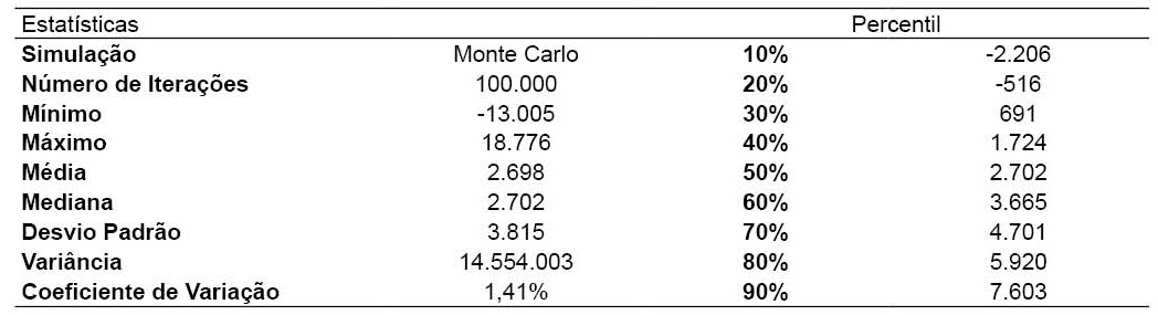 A variável referente ao crescimento projetado foi tratada a partir dos dados coletados, utilizando-se como referência o crescimento projetado da empresa e como variação a diferença entre o crescimento do setor e o crescimento projetado. A partir desses dados, foram realizadas cem mil simulações pelo método de Monte Carlo de cenários utilizando o software Crystal Ball® para verificar o comportamento do VPL do fluxo de caixa, sendo o resumo da simulação apresentado na tabela 3.