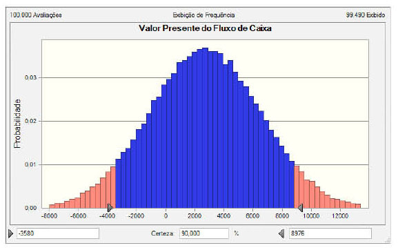 A partir desses resultados foi possível definir uma distribuição normal que demonstrou o comportamento do VPL dos fluxos de caixa, conforme demonstrado no gráfico 1. A análise dos dados a partir da simulação de Monte Carlo demonstra o comportamento do VPL dos fluxos de caixa médio de cem mil simulações e foi possível inferir com 90% de confiabilidade que o valor se encontra no intervalo de R$ -3.580 e R$ 8.976.