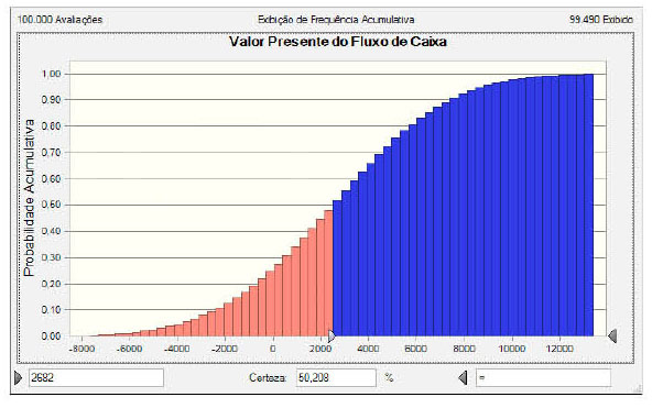 Ao analisar os dois métodos de avaliação, determinístico e estocástico, é possível inferir, pelo método estocástico utilizado, tendo como base o valor determinístico do VPL de R$ 2.682 (apresentado na tabela 2), que 50,21% dos valores vão estar localizados abaixo desse patamar fixo, conforme gráfico 2. Analisando esse valor com base nos resultados do modelo estocástico, infere-se que a empresa apresenta 50,21% de chances de não obter crescimento acima da projeção determinística do setor de siderurgia e, com isso, incorrer em perda de competitividade, por não conseguir acompanhar o crescimento do setor.