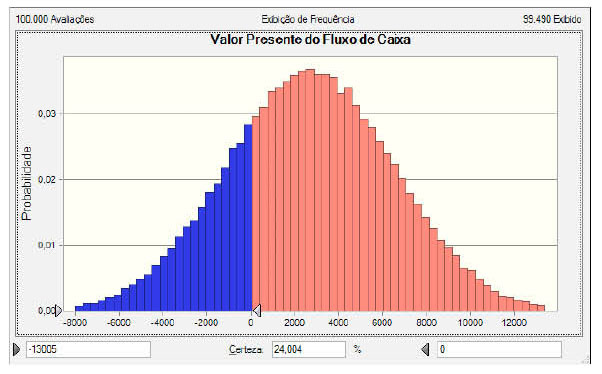 Devido a apresentar oscilações referentes ao crescimento em seus dados históricos, constata-se a probabilidade de ocorrência do VPL do fluxo de caixa negativo para os próximos cinco anos, o qual, neste estudo, foi de 24%, sendo apresentado no gráfico 3, demonstrando que o cenário projetado para o setor e para a empresa se encontra envolto em incertezas.