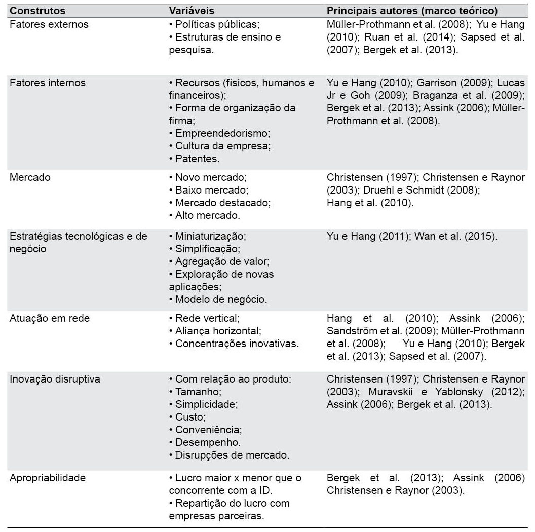 Para este trabalho, partiu-se do pressuposto de que os fatores determinantes da inovação disruptiva poderiam ser encontrados no âmbito externo e interno à firma, bem como nas suas escolhas estratégicas, conforme o mercado, além do seu modo de atuação com vistas à apropriabilidade dos ganhos pertinentes. Desse modo, constam no quadro 1 os construtos e as variáveis deste estudo.