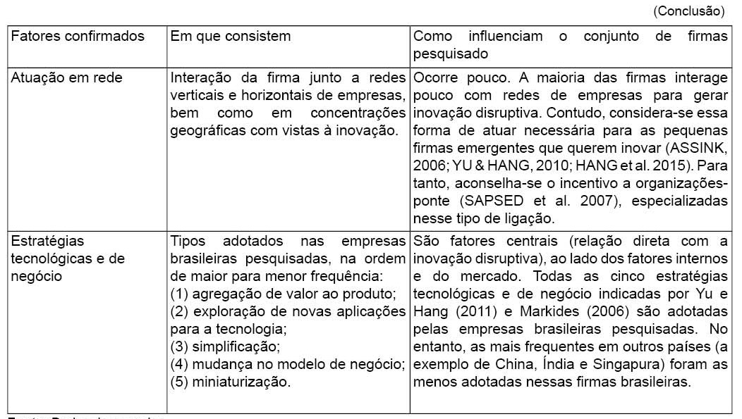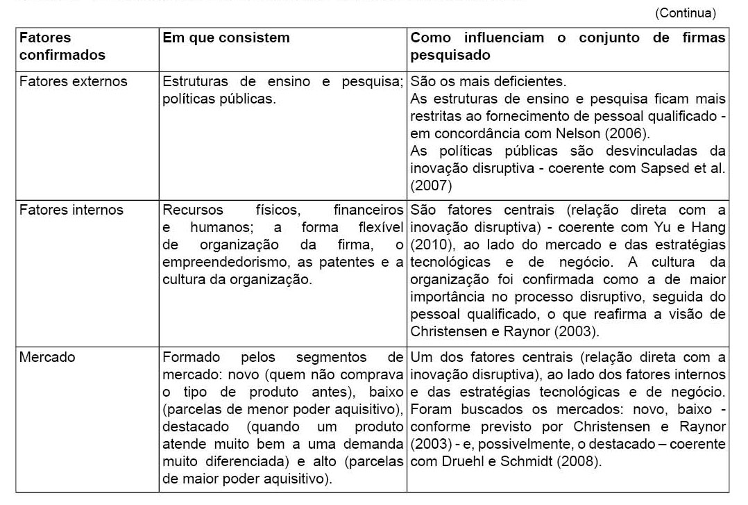 (3) As firmas pesquisadas que exploram todos os fatores descritos no quadro 2, inclusive os fatores externos (estruturas de ensino/pesquisa e políticas públicas), assim como a atuação em rede junto a instituições e empresas, alcançam os melhores resultados com a inovação disruptiva.